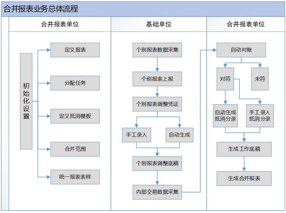 上圖描述的是一次合并的完整應(yīng)用流程,是采用大合并的方式進行合并的操作步驟示意。如果整個集團采用逐級合并的方式進行合并,則每級合并主體都要經(jīng)歷上述合并過程,且上級的合并要在下級的合并完成后進行。用逐級合并的方式完成一次集團合并,相當于多個合并流程的疊加。
